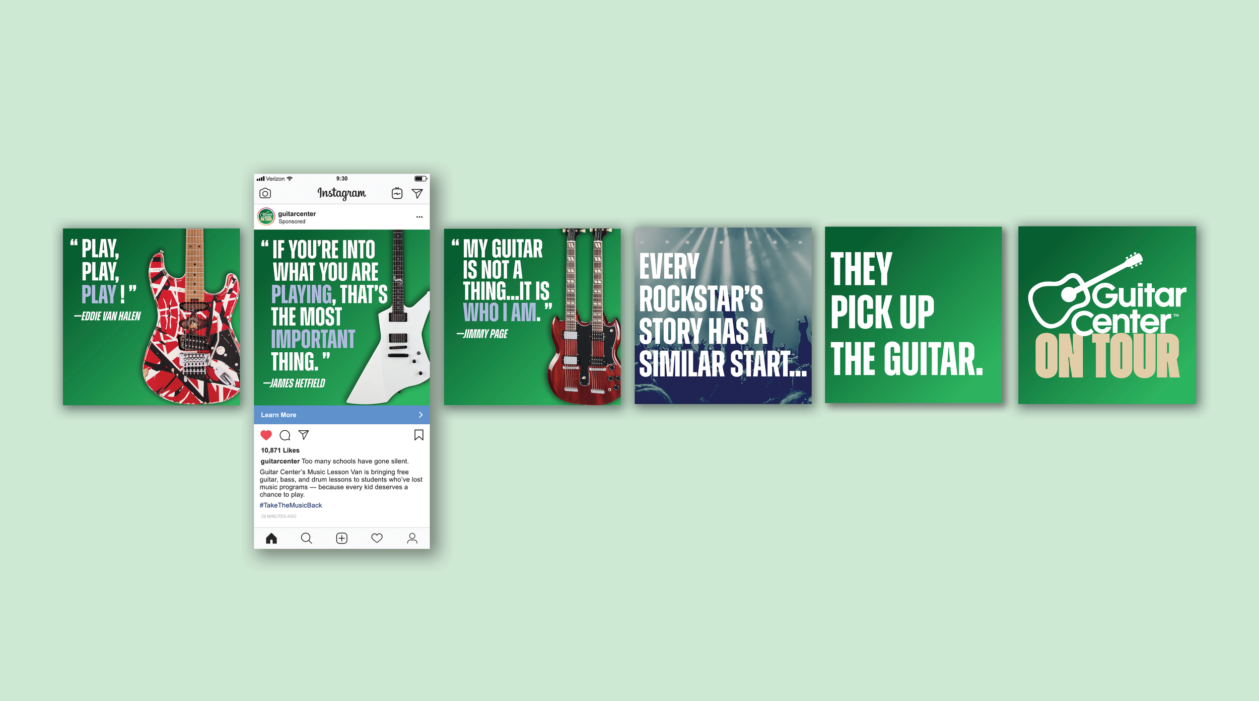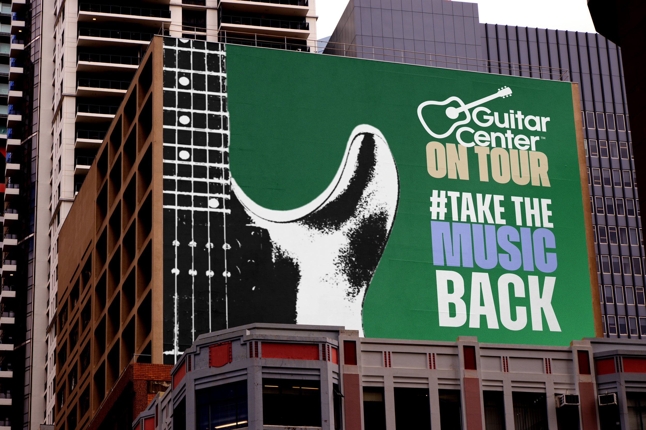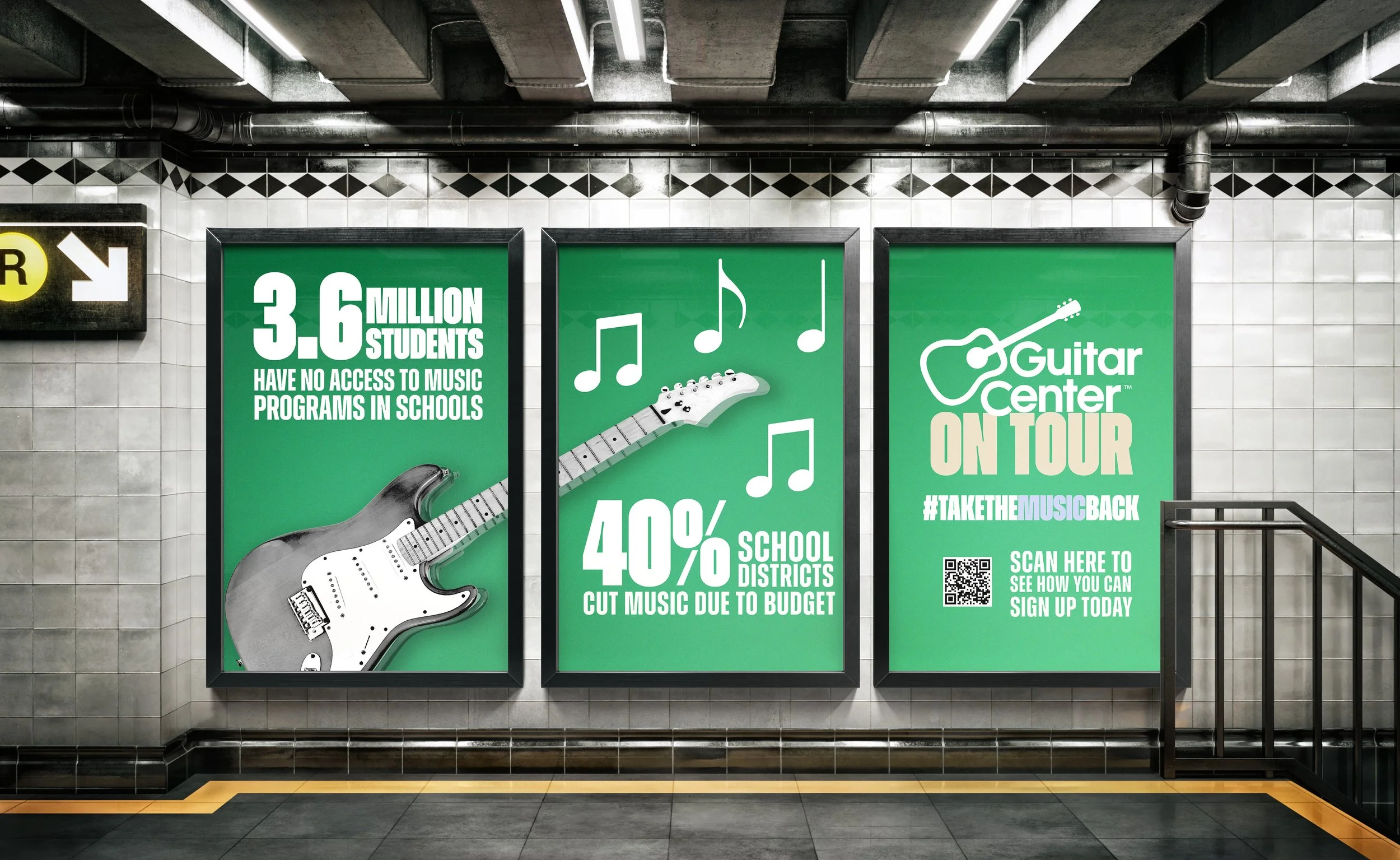Across the country, music programs are disappearing from schools, leaving millions of students without access to creative self-expression. Guitar Center: On Tour is a campaign designed to bring music education back to the classrooms that need it most. The campaign uses a bright, bold color palette and gritty textures to reflect the raw, rock-inspired style of the brand. This initiative sends a music lesson van to select schools, offering free guitar, bass, and drum lessons to students. Through print, social, out of home placements like billboards, van wraps, and wallscapes, as well as merchandise design—the campaign spreads one clear message: it’s time to take the music back for schools. Every kid deserves the chance to play, create, and express themselves through sound.