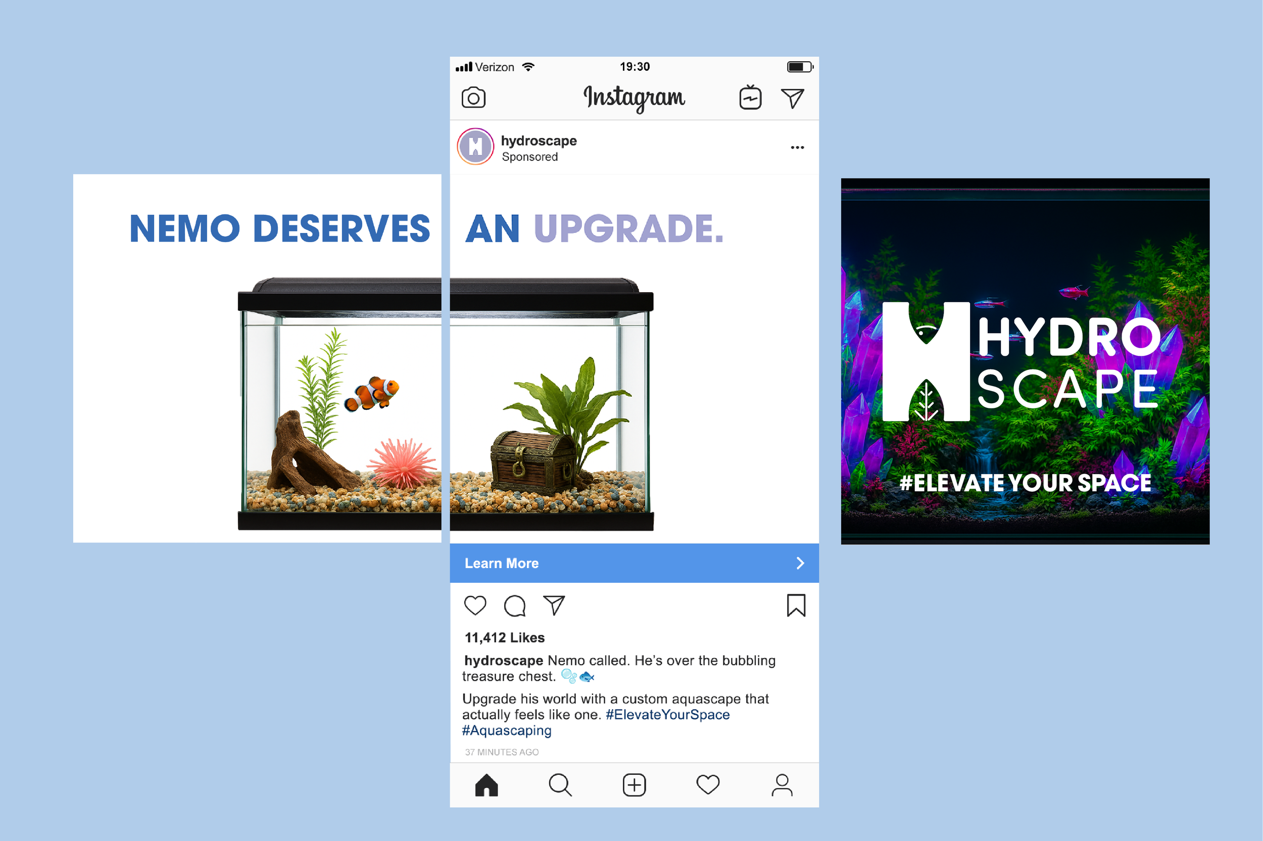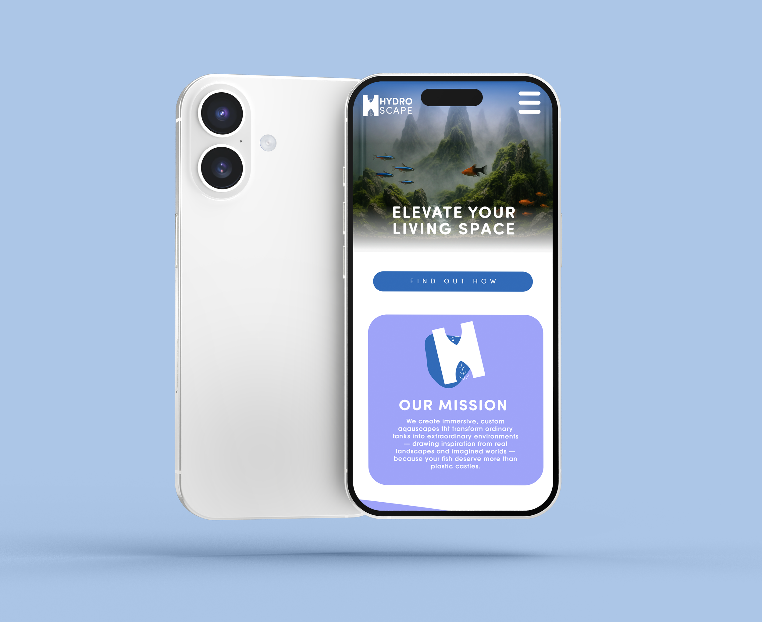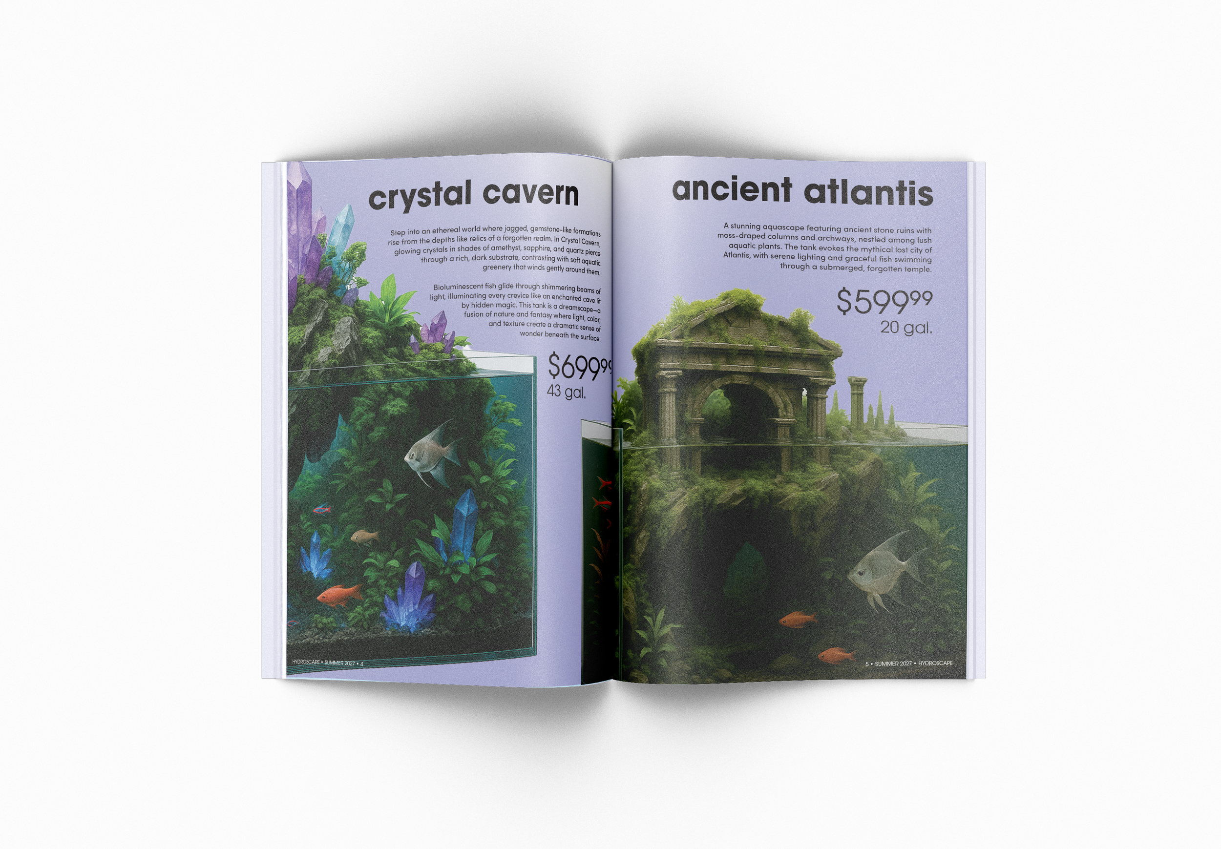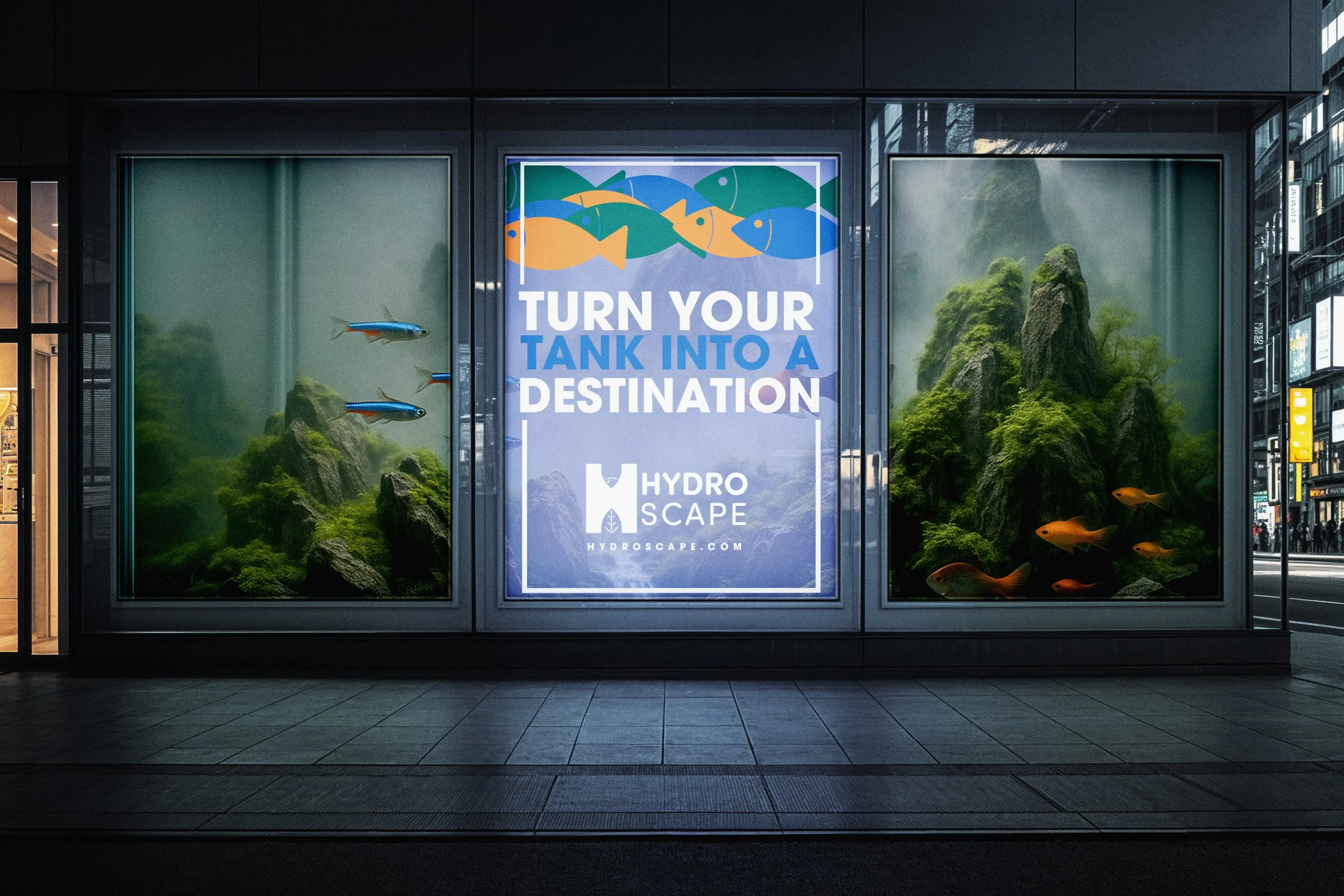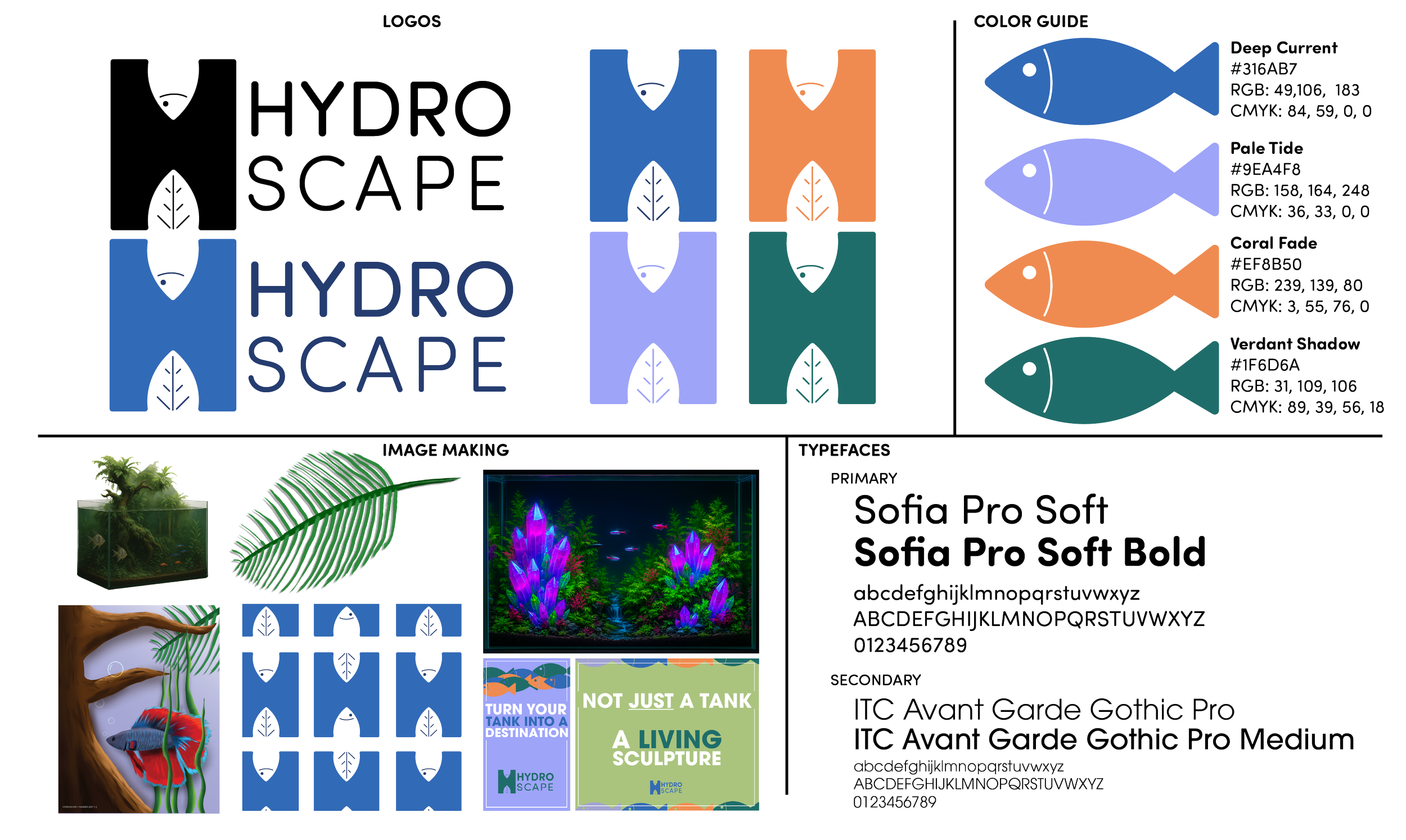 Hydroscape transforms ordinary fish tanks into immersive, one-of-a-kind aquatic worlds. Inspired by the art of aquascaping, the brand redefines the boundaries between design and nature—turning home aquariums into living sculptures. This campaign includes a complete identity system featuring logo design, branding, product catalogue, and a full advertising suite across social media, transit, and environmental placements. The project also features a responsive website for desktop and mobile devices. All logos and digital illustrations were hand-created, while the photorealistic aquascapes were generated using AI to capture a futuristic, ethereal tone. Hydroscape invites viewers to dive deeper—where imagination and design flow together beneath the surface.