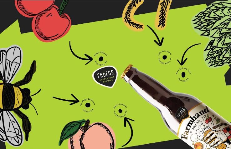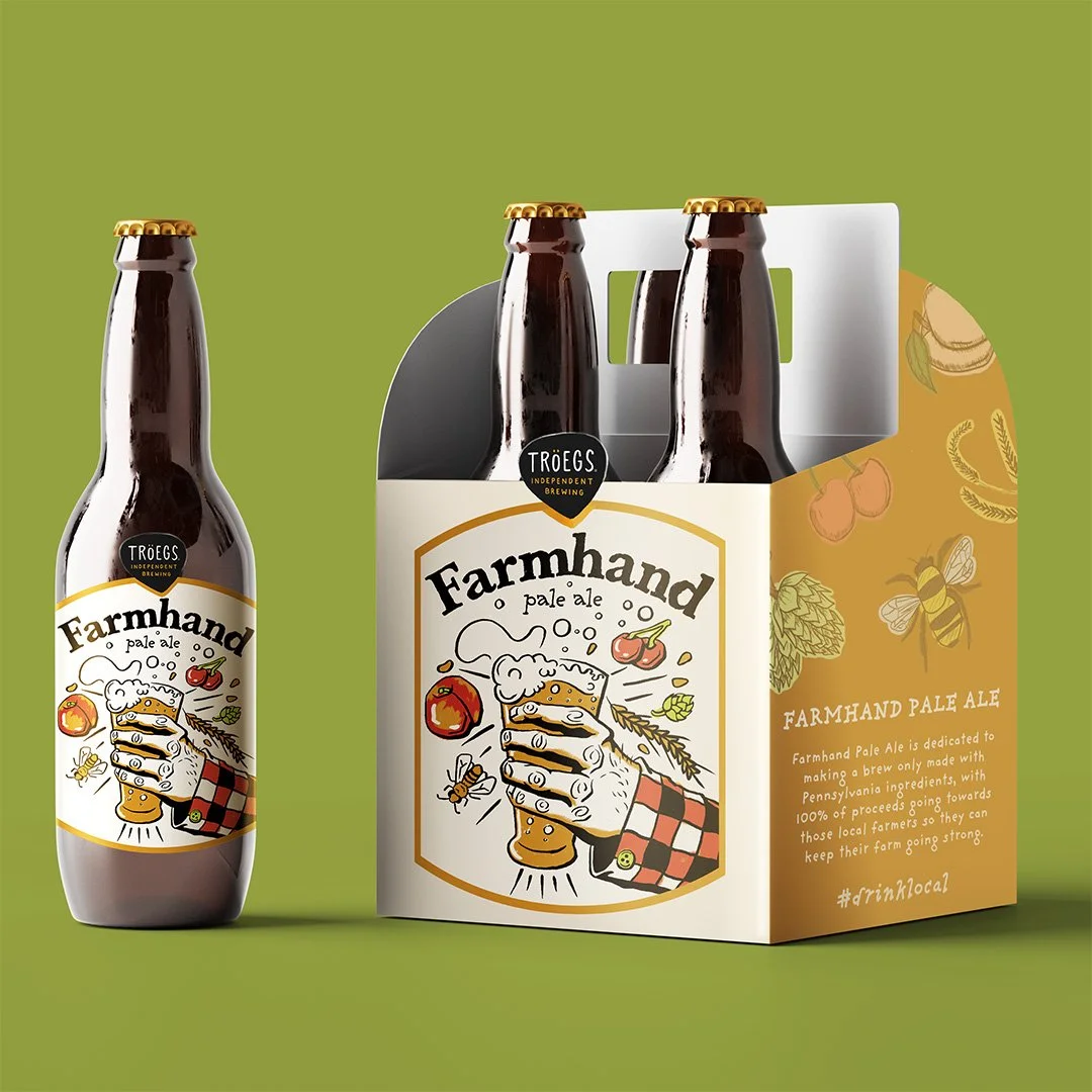 Tröegs Farmhand Pale Ale is a nonprofit brew created to support local farmers across Pennsylvania. Made entirely with locally sourced ingredients, 100% of the profits go directly to helping farmers keep their operations thriving. All imagery and textures in this campaign were handcrafted to reflect the authenticity and care behind the concept. Developed in collaboration with Brayden Wisner, this corporate advertising campaign includes an in-brewery exhibition poster, label design, and social media promotion encouraging people to drink local and give back to their community.